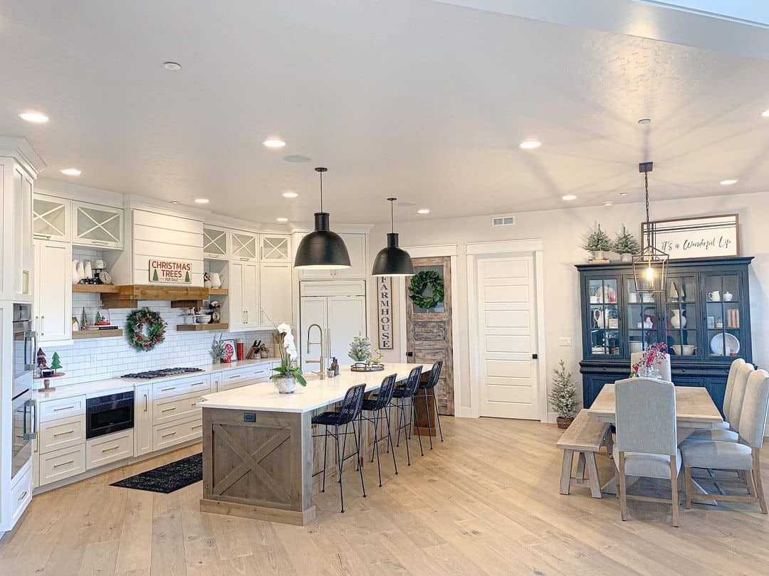 19 of 41 White Kitchen with Wood Accents and Light Floors. Example of a farmhouse open concept kitchen design with an undermount sink light wood floor shaker cabinets medium tone wood cabinets white upper cabinets quartz countertops white. Farmhouse Light Wood Floor Dining Room Ideas.